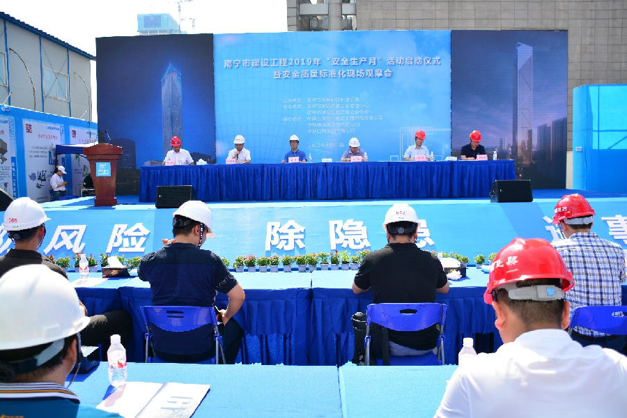 2019年6月14日,公司組織參加了由南寧市住建局、南寧市建管中心、南寧市建設質(zhì)安協(xié)會(huì )、中建三局一公司、中鐵四局、中鐵隧道局聯(lián)合承辦的南寧市建設工程2019年“安全生產(chǎn)月”活動(dòng)啟動(dòng)儀式暨安全質(zhì)量標準化現場(chǎng)觀(guān)摩會(huì )。今年是全國第18個(gè)“安全生產(chǎn)月”,以“防風(fēng)險、除隱患、遏事故”為主題。啟動(dòng)儀式由市建設質(zhì)安協(xié)會(huì )李壽坤會(huì )長(cháng)主持,市住建局黃贊副局長(cháng)、市建管中心錢(qián)強主任、中建三局一公司廣西公司總經(jīng)理張少林、廣西威壯房地產(chǎn)有限公司總經(jīng)理劉超、廣西威壯房地產(chǎn)有限公司副總經(jīng)理洪志星出席會(huì )議,參加啟動(dòng)儀式的還有各縣、城區、開(kāi)發(fā)區主管部門(mén)領(lǐng)導,駐市施工、監理企業(yè)及項目業(yè)主主要負責人。