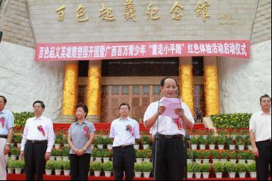 6月28日下午,百色市百色起義紀(jì)念館廣場紅旗招展,紅歌激揚(yáng),百色起義英雄雕塑園開園暨廣西百萬青少年“重走小平路”紅色體驗(yàn)活動啟動儀式在這里隆重舉行。廣西自治區(qū)黨委書記、自治區(qū)人大常委會主任郭聲琨出席儀式,并與自治區(qū)黨委副書記陳際瓦,自治區(qū)黨委常委、秘書長余遠(yuǎn)輝一道,共同為團(tuán)干部、青聯(lián)委員、青年文明號集體代表、少先隊(duì)員等青少年“重走小平路”團(tuán)隊(duì)代表授旗,陳際瓦宣布百色起義英雄雕塑園開園、“重走小平路”紅色體驗(yàn)活動啟動,嘹亮的軍號響徹廣場上空,正式拉開了“重走小平路”紅色體驗(yàn)活動的序幕。