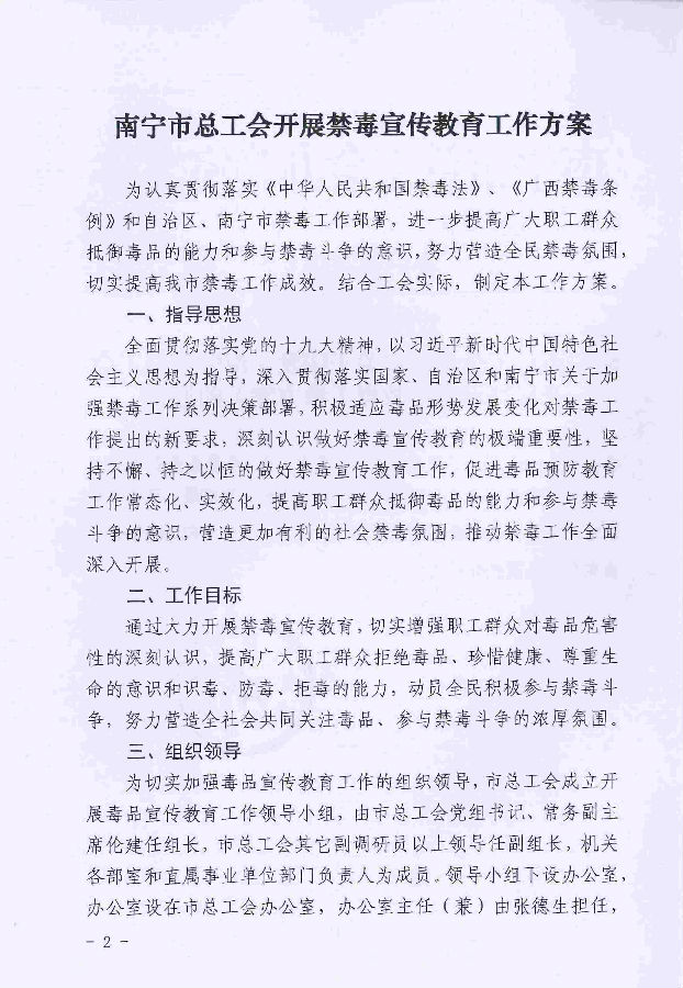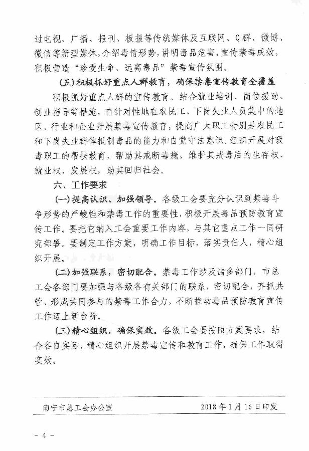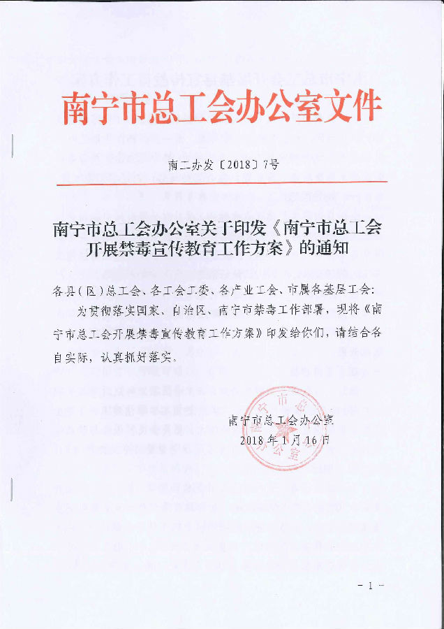 南寧市總工會(huì )辦公室關(guān)于印發(fā)《南寧市總工會(huì )開(kāi)展禁毒宣傳教育工作方案》的通知