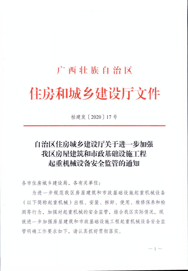 自治區住房城鄉建設廳關(guān)于進(jìn)一步加強我區房屋建筑和市政基礎設施工程起重機械設備安全監管的通知— —桂建發(fā)〔2020〕17號