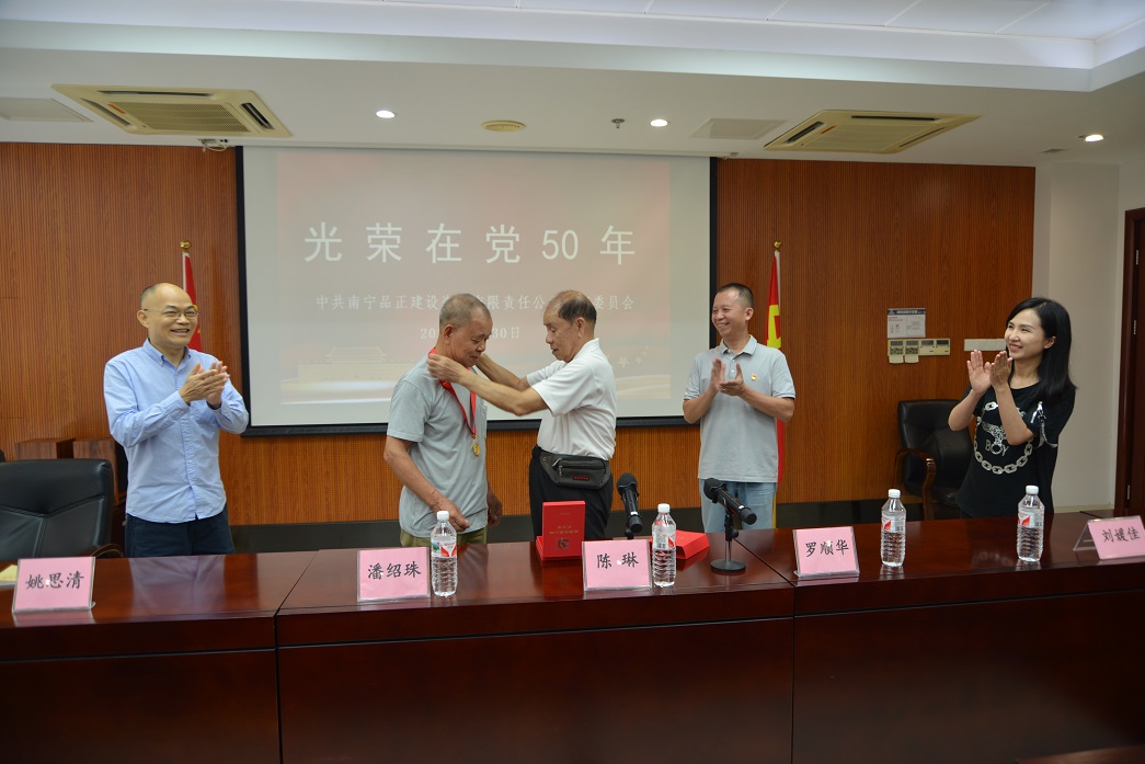 最后,南寧市住建行業(yè)黨委陳琳副書記發(fā)言致詞,他指出:“光榮在黨50年”紀(jì)念章是黨員用半生奉獻(xiàn)換來的榮譽,這份榮譽是廣大黨員在學(xué)習(xí)黨史過程中的鮮活范例,榮譽之光更是照亮我們黨前行之路的一盞“明燈”。他希望潘紹珠保重身體,繼續(xù)發(fā)揮余熱,永葆政治本色;期望廣大年輕黨員以老黨員為榜樣,永遠(yuǎn)聽黨話、感恩黨,跟黨走,賡續(xù)光榮傳統(tǒng),傳承精神譜系,砥礪奮進(jìn)、接棒前行,奮力在全面建設(shè)社會主義現(xiàn)代化國家新征程上譜寫新篇章!