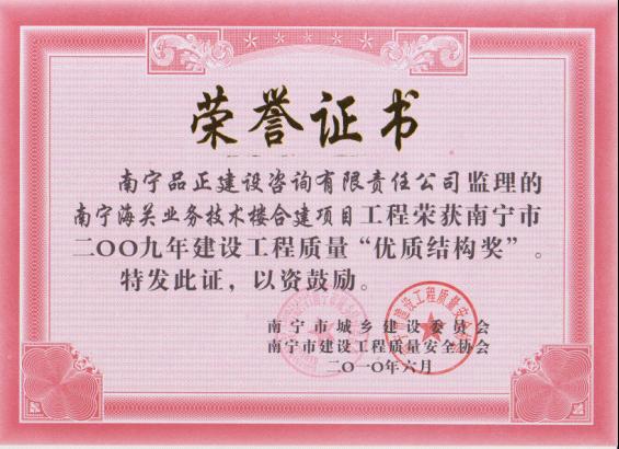 南寧品正負責監理的金龍·理想1號5#、6#樓工程、中都·澳海藍灣工程12#、13#、15#樓工程、南寧海關(guān)業(yè)務(wù)技術(shù)樓合建項目、中華路高層職工住宅樓工程、南寧大商匯1#商業(yè)樓等多個(gè)工程榮獲南寧市城鄉建設委員會(huì )、南寧市建筑工程質(zhì)量安全協(xié)會(huì )頒發(fā)的南寧市建設工程“優(yōu)質(zhì)結構獎”。