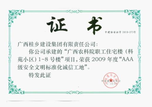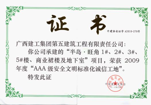2010年6月,南寧品正負責監理的半島·旺角1#2#3#5#樓及商業(yè)裙樓及地下室、廣西農科院職工住宅樓(科苑小區)工程榮獲中國建筑業(yè)協(xié)會(huì )頒發(fā)的 “AAA級安全文明標準化誠信工地”稱(chēng)號。