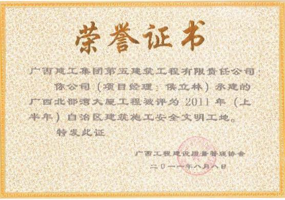 廣西北部灣大廈工程被評為2011年(上半年)自治區建筑施工安全文明工地榮譽(yù)證書(shū)